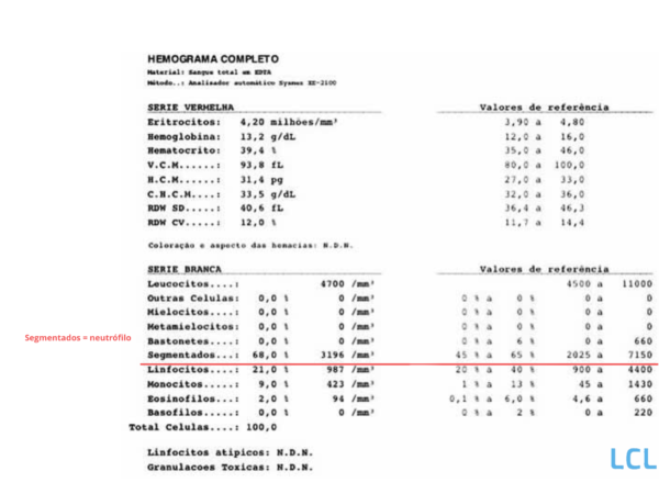 Neutropenia é nome que damos à contagem baixa de neutrófilos. Neutrófilos ou segmentados são tipos de glóbulos brancos que são produzidos na medula óssea e combatem infecções em nosso corpo. Quando há uma diminuição no número de neutrófilos, o risco de infecções aumenta, particularmente daquelas causadas por bactérias ou fungos.